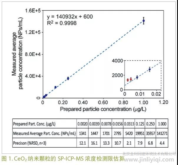 ΪÁËÈ·¶¨CeO2ÄÉÃ׿ÅÁ£µÄ·½·¨¼ì³öÏÞ£¨MDL£©£¬¶ÔÓÉһϵÁÐ0.5mg/LµÄCeO2ÄÉÃ׿ÅÁ£ÓÃ0.025mM½¹Á×ËáÄÆÈÜҺϡÊ͵õ½µÄ±ê׼ƷÖи÷ÖÖ¿ÅÁ£µÄŨ¶È£¨·¶Î§ÔÚ500ÖÁ256000NPs/mL£©½øÐÐÁË·ÖÎö¡£Èçͼ1 Ëùʾ£¬²âµÃµÄ¿ÅÁ£Å¨¶È±íÃ÷¿ÅÁ£Å¨¶È·¶Î§ÔÚ0.0078g/LÖÁ1g/LÖ®¼ä³ÊÏßÐÔÇ÷ÊÆ¡£µ«µ±¿ÅÁ£Å¨¶È½øÒ»²½½µµÍÖÁСÓÚ0.0078g/Lʱ£¬Êý¾ÝÆ«ÀëÁËУ׼ÇúÏß¡£Õâ±íÃ÷ĿǰȷÁ¢µÄSP-ICP-MS·½·¨Äܹ»¾«È·¼ì²â×îµÍ1700NPs/mLµÄCeO2ÄÉÃ׿ÅÁ££¬ÆäÁéÃô¶È¼«¸ß¡£