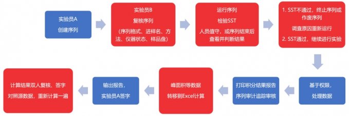 ÒÔQC¼ìÑéʵÑéÊÒΪÀý£¬ÏÂͼÃèÊöÁ˵äÐ͵ÄÉ«Æ×¼ìÑ鹤×÷Á÷³Ì£ºº¸ÇÁË´ÓÐòÁд´½¨µ½ÏµÍ³ÊÊÓÃÐÔ¿¼²ì£¬´ÓÊý¾Ý´¦Àíµ½½á¹û¼ÆË㣬´Ó±¨¸æÊä³öµ½×îÖÕË«È˸´ºË£¬ÆäÖÐÓ°ÏìЧÂʼ°¿ÉÄÜÔö¼Ó·çÏյĹؼü²½ÖèÓɺìÉ«¿é¸ßÁÁ±ê¼Ç¡£